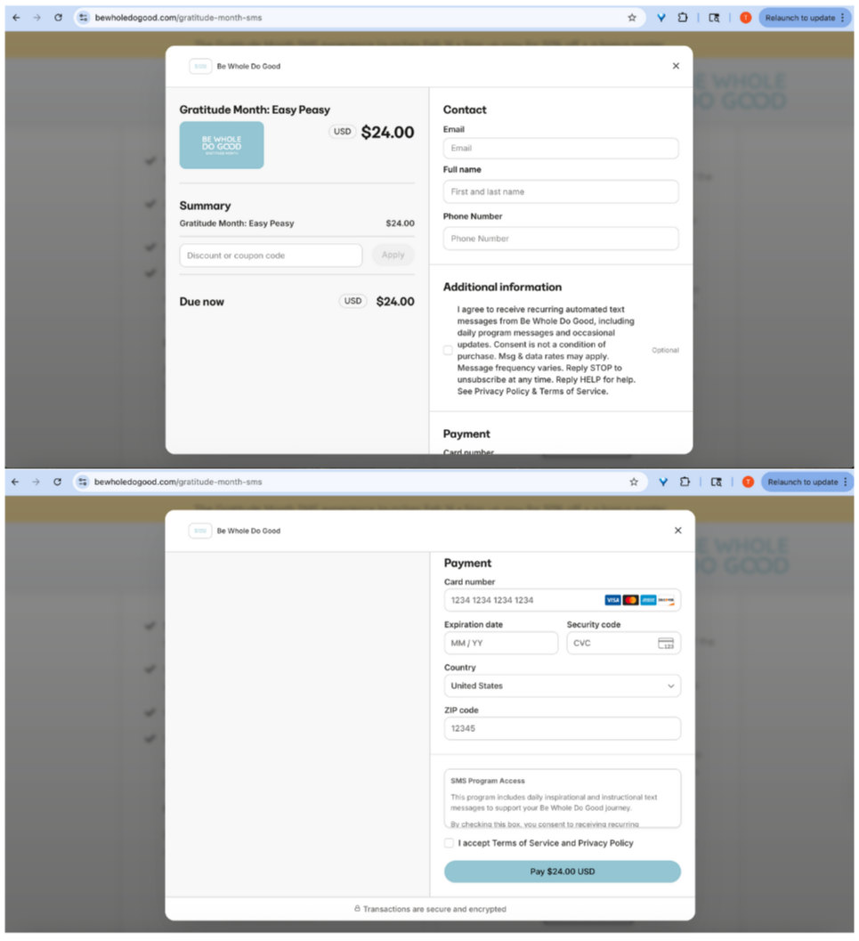 Within the checkout form, users may choose to check a separate, unchecked SMS consent checkbox that explicitly states they agree to receive recurring automated text messages from Be Whole Do Good.